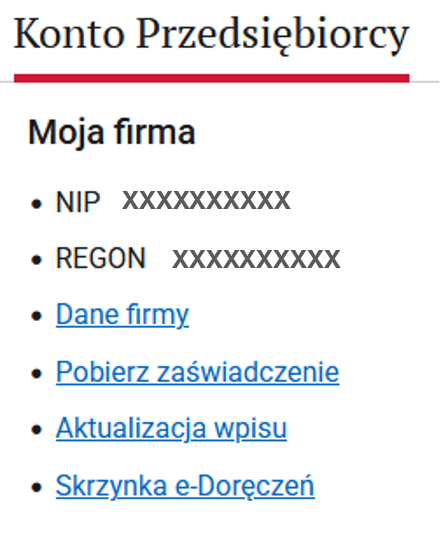 Nastąpi logowanie do Twojego konta przedsiębiorcy na portalu biznes.gov.pl (proszę się nie przejmować nawet, jeśli nigdy wcześniej nie zakładaliście konta przedsiębiorcy) i po przejściu przez parę obowiązkowych informacji uzyskamy widok w prawym menu: